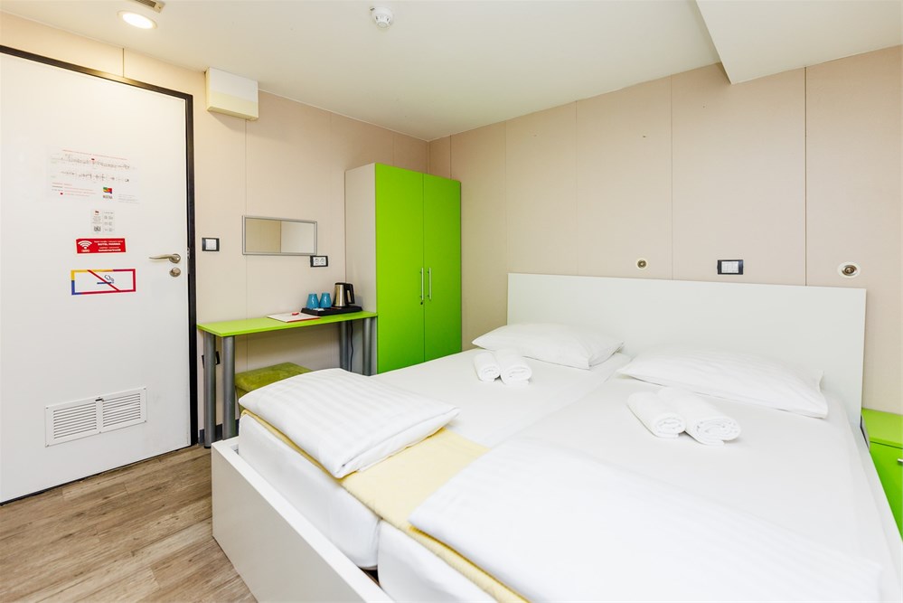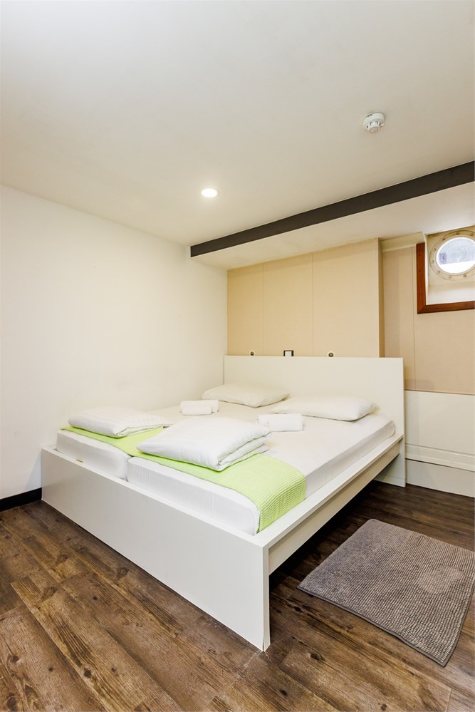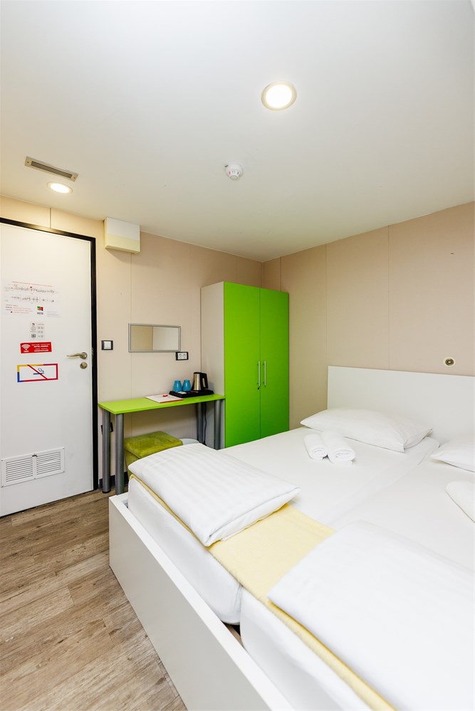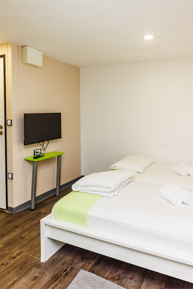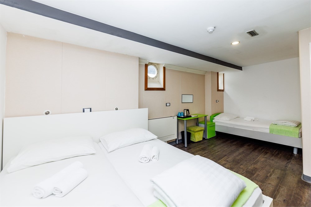 Welcome to our spacious triple room at Botel Marina, a unique hotel‑accommodation in the heart of Rijeka on the Kvarner coast. This charming accommodation offers comfort and authentic nautical ambiance: three beds, custom furniture, fully equipped bathroom, air conditioning, heating, free WiFi, and a view through a genuine ship’s porthole. The room is non‑smoking, with linens and towels included. The bed and breakfast accommodation includes a buffet breakfast served every morning at Botel Marina’s restaurant. Guests enjoy a 24‑hour reception, room cleaning service, parking upon request, option for a child’s cot if travelling with children, and access to amenities that combine hotel‑style service with the casual feel of a boat hostel.